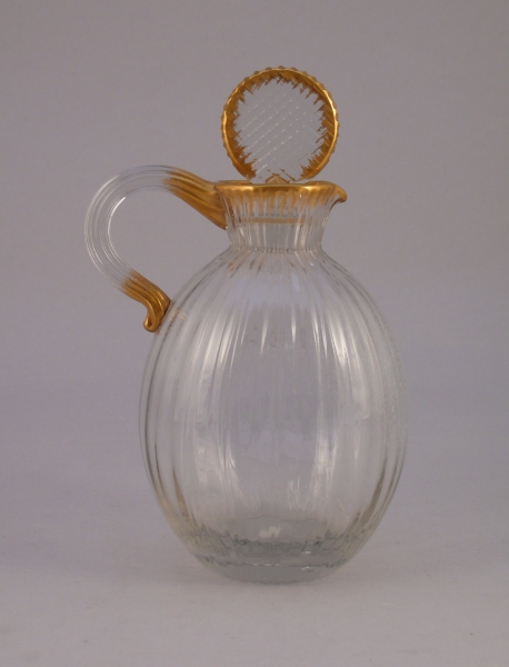 CARAFE ovoïde en cristal à côtes. Anse rapportée à chaud. Bouchon à effet gaufré. Rehauts or.