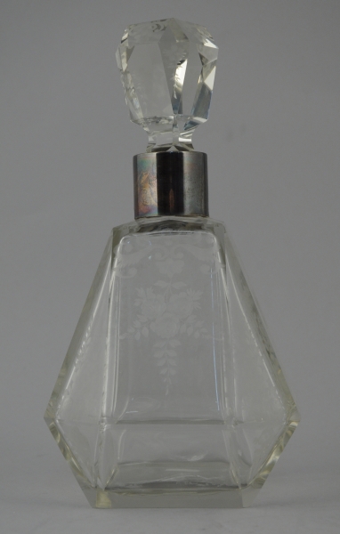CARAFE en cristal taillé à pans coupés, gravé de guirlandes et bouquets fleuris. Bouchon assorti. Le col cerclé en argent.