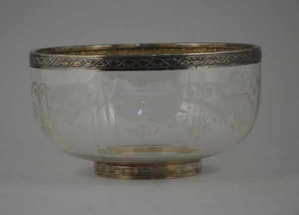 COUPE en cristal gravé d'étoile, de facettes, et de cartouches à entrelacs et feuillages. Monture, base et cerclage en argent ouvragé de ruban. Poinçon Minerve. Haut. 11,5 Diam. 21 cm.