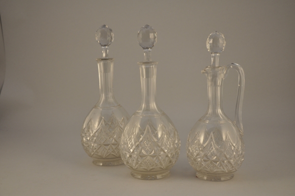 ENSEMBLE en CRISTAL taillé à décor rayonnant et de pointe de diamant comprenant une paire de carafes et une aiguière, avec leur bouchon facetté.