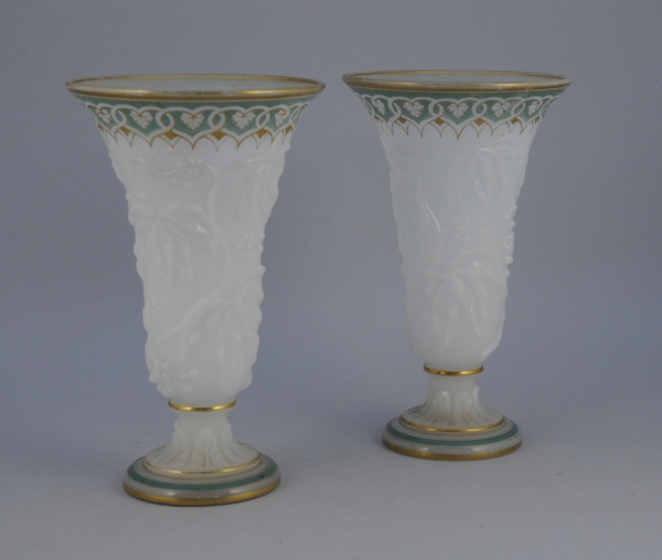 Paire de VASES en verre opalin blanc de forme cornet. Décor moulé en relief de branchages et peint d'une frise verte et doré en bordure et sur le socle.