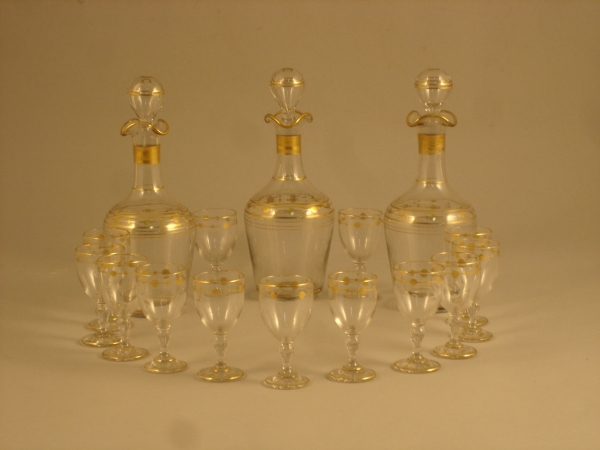 SERVICE à LIQUEUR comprenant une suite de 13 verres à pied et 3 carafes en verre, filets dorés et pois en ligne. XIXème. Haut. des carafes: 19 cm.