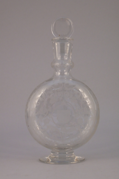 BACCARAT pour Cognac J. et F. MARTELL. CARAFE sur pied en cristal en forme de gourde aplatie, gravée à l'acide de rinceaux feuillagés. Marquée.