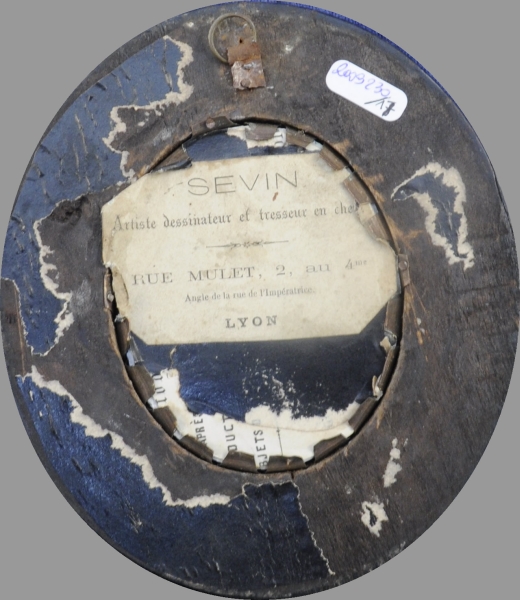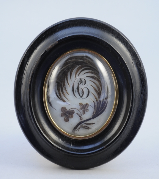 Cheveux bruns collés sur verre formant une palme courbée centrée du monogramme "C.C" et flanquée de deux fleurettes. Fond de papier blanc. Porte une étiquette au dos: "SEVIN artiste dessinateur et tresseur en cheveux; Rue Mulet 2, au 4ème. LYON". Cadre en bois noirci et baguette de laiton, verre bombé.