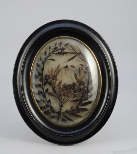 Cheveux châtains et fils de fer collés sur verre simulant, en volume, des fleurs à cinq pétales entourées de branchages. Inscription peinte sur verre "J.C." et "C.C.". Cadre en bois noirci et baguette de laiton, verre bombé.