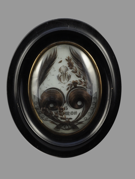 Cheveux châtains collés sur verre représentant deux volutes affrontées flanquées de mèches effilées et branchages stylisés, l'ensemble lié par un noeud. Inscriptions en cheveux du chiffre "G.M." et peinte "15 janvier 1910". Fond de papier blanc. Bois noirci et baguette de laiton, verre bombé.