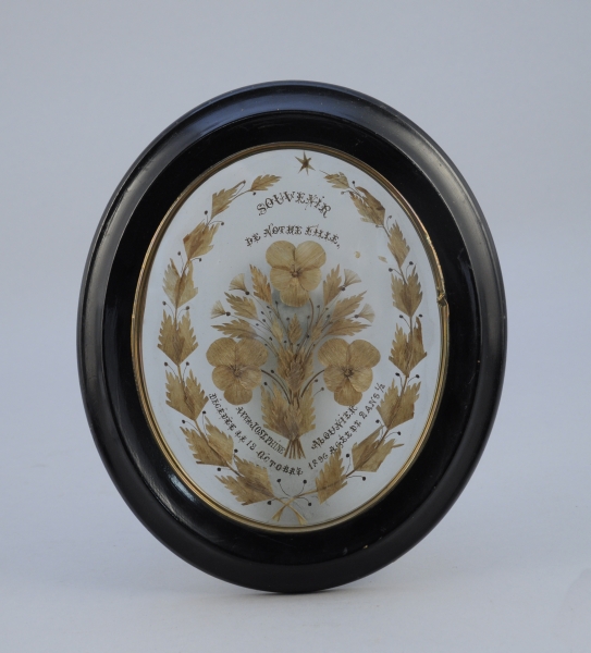 Cheveux blonds collés sur verre sablé opaque à motif d'un bouquet de pensées et feuillages stylisés dans un entourage de branchages. Inscription peinte sur le verre "Souvenir de notre fille", "AnnaJoséphine Alounier", "Décédée le 18 octobre 1896 âgée de 2 ans 1/2". Sans papier de fond. Cadre en bois noirci et baguette de laiton, verre plat.