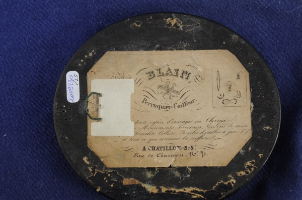 Cheveux blonds collés sur verre à motif d'une pensée entourée d'une couronne de feuillage stylisé. Fond de papier blanc. Porte au dos une étiquette: "BLAIN Perruquier Coiffeur à Chatillon s/Se". Cadre en bois noirci et baguette de laiton, verre bombé.