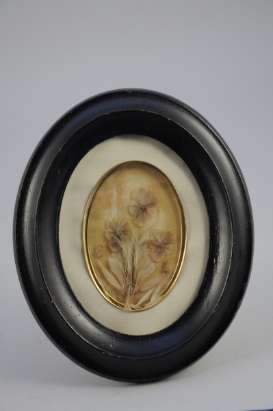 Cheveux blonds clairs collés sur verre représentant trois fleurs en bouquet. Inscrit en poudre de cheveux "E.L.". Fond de papier crème. Cadre en bois noirci et baguette de laiton, verre bombé.