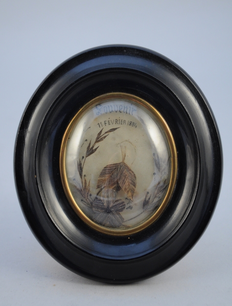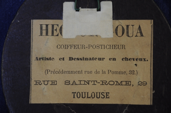 Cheveux bruns collés sur verre à motif d'une pensée entourée d'une couronne de feuillage stylisé. Inscription en poudre de cheveux: "Souvenir 11 février 1884", et "Z.F.". Fond de papier crème. Porte au dos une étiquette: "Hector Goua Coiffeur Posticheur à Toulouse". Cadre en bois noirci et baguette de laiton, verre bombé.