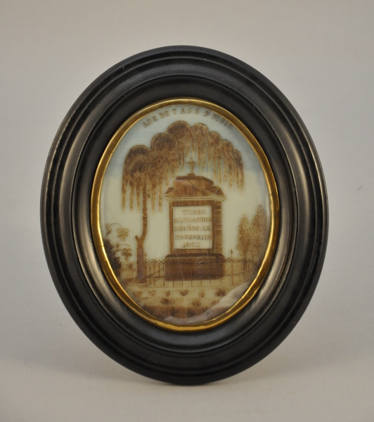 Cheveux blonds collés sur verre représentant un monument funéraire sous un arbre. Fond de papier coloré bleu à l'imitation du ciel. Porte les inscriptions en cheveux: "Agé de 7 ans 9 mois" et "Tissu Alexandre décédé le 20 février 1852". Cadre en bois noirci et baguette de laiton, verre bombé.