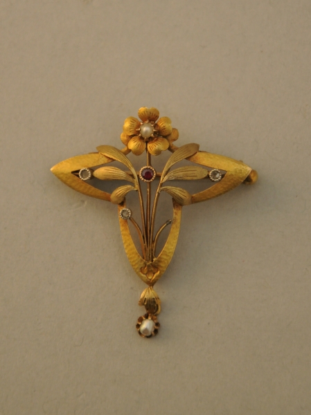 PENDENTIF en or, perle et grenat à motif d'une fleurette.