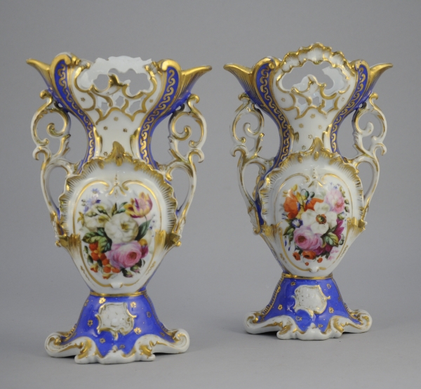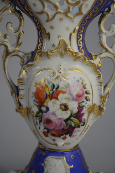 PAIRE de VASES de mariés en porcelaine blanche à fond bleu, décor doré, ajouré et peint de fleurs.