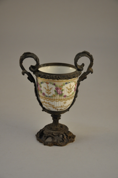 Petit VASE sur piédouche en porcelaine blanche à décor doré et peint de fleurs, et monture en bronze ciselé.