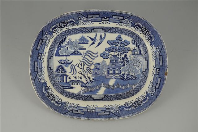 ANGLETERRE. PLAT ovale en faïence fine à décor imprimé en bleu d'un paysage et architecture dans le goût de la Chine.