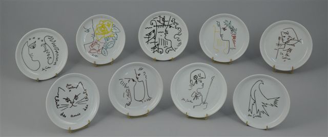COCTEAU (d'après). Sept ASSIETTES en porcelaine à décor imprimé en brun des compositions de l'artiste. Editions Pro-Ceram, Limoges. Coffret. Diam. 24 cm.