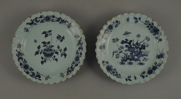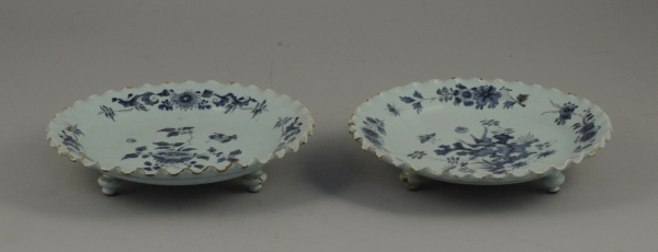BERLIN, manufacture de Cornélius Funcke (?). PAIRE DE COUPES MONTÉES sur trois petits pieds toupies en faïence à bords volants. Décor en camaïeu de bleu au centre d'un bouquet et d'un oiseau sous une lune croissante, augmentée pour l'une d'un insecte et sur l'aile de guirlandes fleuries augmentées pour l'une de deux insectes