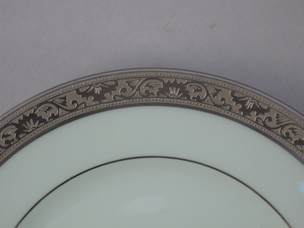 SERVICE de TABLE 58 pièces en porcelaine céladon à décor sur l'aile et en bordure d'une frise incrustée platine, comprenant: 23 assiettes plates, 12 assiettes à dessert, 12 assiettes à thé, 11 tasses et sous-tasses à café. RAYNAUD à Limoges.