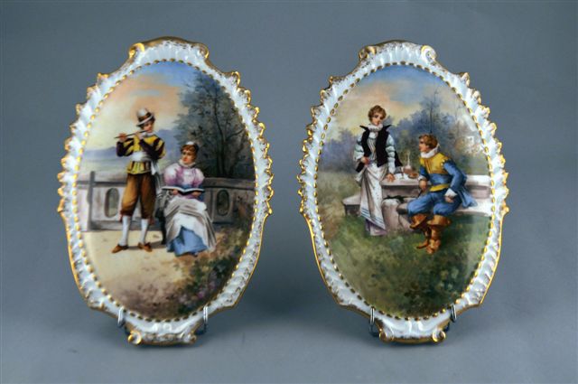 VARIA. Paire de MÉDAILLONS OVALES en porcelaine, à décor peint de scènes galantes dans le style Troubadour, bords festonnés dorés. Marque à l'étoile "France".