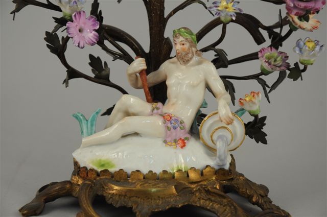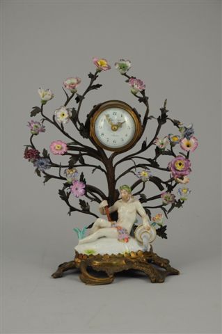 SAMSON? PENDULE "La source" en porcelaine peinte polychrome et bronze . La base représentant un homme accoudé sur un vase. Le cadran, marqué Crozier (?) à Paris, enserré dans une arborescence garnie de fleurs polychromes dans le goût de Saxe ou de Vincennes. Signée. Base en bronze ajouré d'inspiration rocaille.