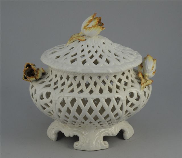 ITALIE. SOUPIERE décorative ovale en faïence. Elle repose sur quatre pieds en volutes feuillagées, le coprs et le couvercle ajouré à croisillons, anses latérales et prise du couvercle formés de tulipe en ronde bosse peinte en ocre et jaune. Haut. 30, Long. 31, Larg. 24 cm. (quelques éclats et manques)