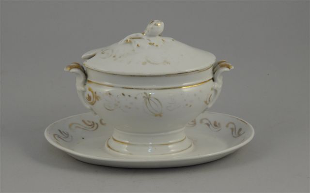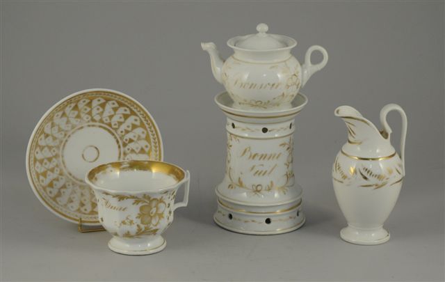 PARIS et VARIA. LOT en porcelaine comprenant: TISANIÈRE "Bonsoir, Bonne nuit" à décor peint à l'or de leurs (Haut. 25 cm, éclats à la verseuse, couvercle rapporté, usures à l'or). SAUCIÈRE ovale à décor, anses latérales en volutes feuillagées, prise du couvercle en bouton au naturel, marque en rouge "RS". POT à LAIT peint à l'or (usures). TASSE à côtes peinte à l'or "Je vous aime" au centre d'une guirlande ornée de deux larges fleurs et une SOUS-TASSE peinte à l'or de motifs gémétriques rayonnants (usures). XIXème.