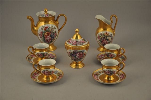 PARIS (dans le goût de). Partie de SERVICE À CAFÉ de 11 pièces en porcelaine dorée à décor de bouquet de fleurs dans des réserve. Il comprend 4 tasses et sous-tasses, une cafetière, un pot à lait et un sucrier couvert. Style Restauration.