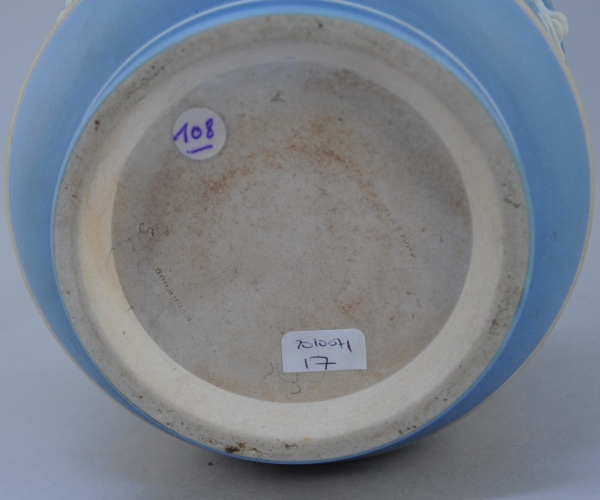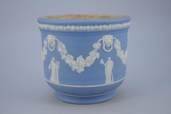 Cache-pot circulaire en faïence fine anglaise. Fond bleu et décor blanc en camée de pampres de vigne et allégories antiques des arts.