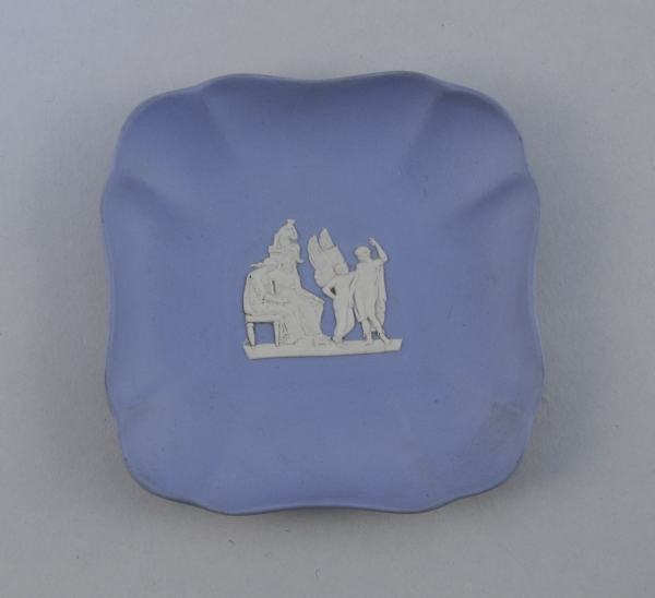 Cendrier en faïence fine anglaise. Fond bleu et décor blanc en camée d'une scène à l'antique.