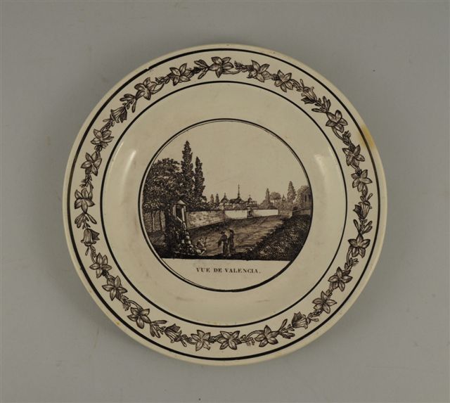 VARIA. ASSIETTE en faïence fine à décor dans le bassin d'une vue de Valencia, animée de personnages. Aile de frise florale. XIXème. Diam. 24,5 cm (infime éclat)