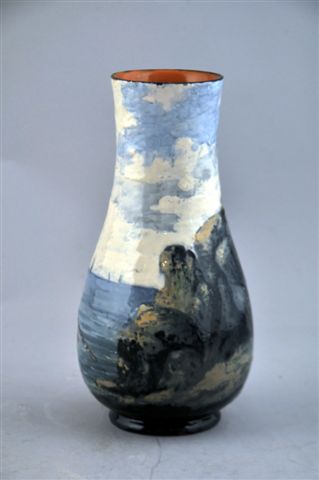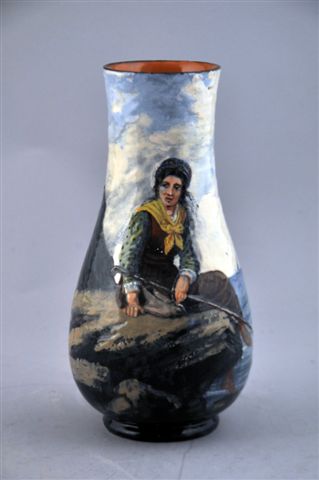 VASE piriforme en barbotine, à décor polychrome d'une jeune femme assise sur des rochers en bord de mer. Attribué à Théodore LEFRONT (actif de 1860 à 1888).