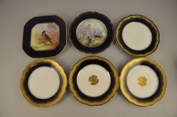 Réunion de SIX ASSIETTES à gateaux en porcelaine à aile bleu de four et décor incrusté or. Deux à décor peint d'oiseaux.