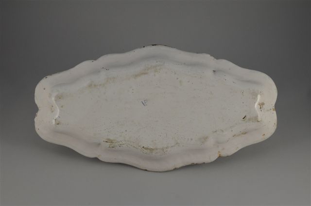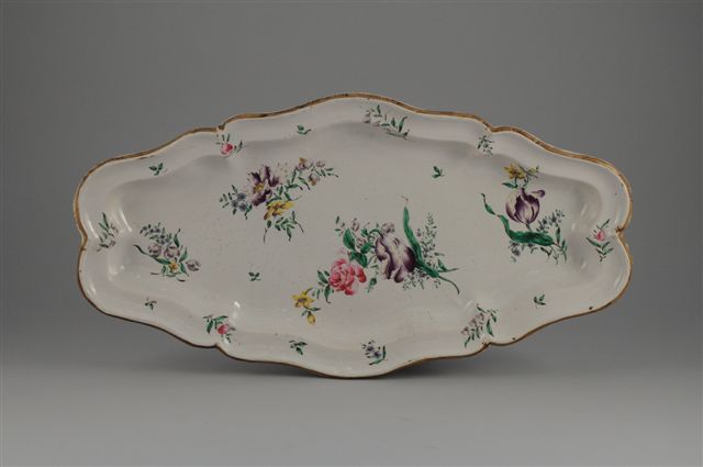 MARSEILLE (dans le genre de). PLAT ovale en faïence de petit feu à décor polychrome floral. Aile chantournée. Marque dans le genre de la Veuve Perrin. Long. 61, Larg. 32 cm.