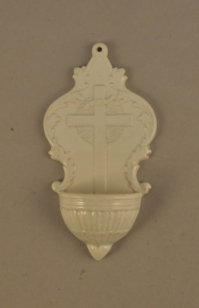 GIEN. Petit BÉNITIER ROCAILLE en faïence monochrome, au panier tressé et à la croix ensoleillé.