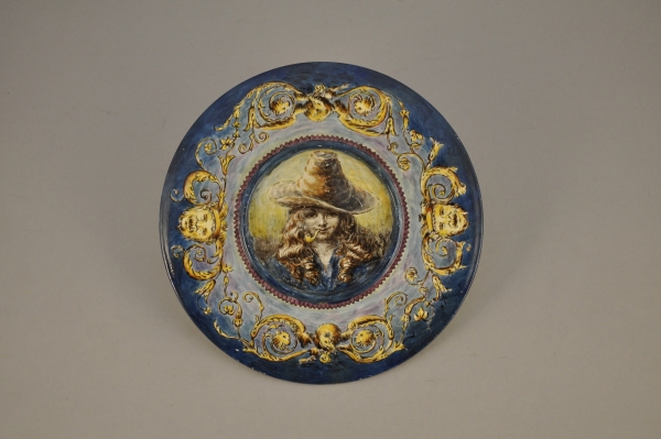 GIEN. ASSIETTE D'AIGUIÈRE sur talon en faïence, à décor d'un enfant à la pipe dans un entourage de rinceaux animés.