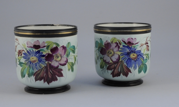 PAIRE de CACHES-POTS en faïence fine, à décor peint d'anémones et branchages sur fond bleu clair. Bordure peinte noir au filet doré.