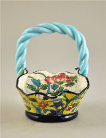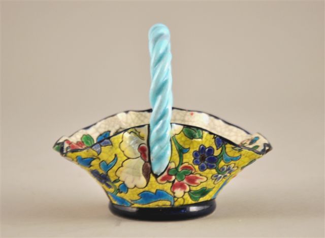 LONGWY. PANIER À ANSES TORSADÉES en faïence, à décor de fleurs sur fond jaune à l'extérieur et fleurs sur fond blanc gris craquelé à l'intérieur. Anse torsadée bleue turquoise.