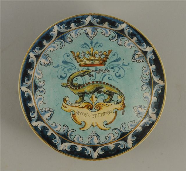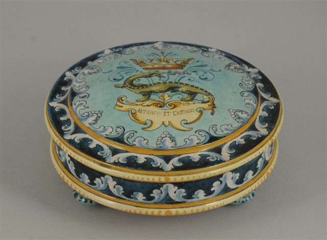 BLOIS. BONBONNIÈRE en faïence de forme circulaire, reposant sur trois petits pieds toupies. Décor sur le couvercle à la salamandre couronnée surmontant la devise "Nutrisco et Exstingo" sur fond turquoise dans un encadrement de feuillages et de lambrequins stylisés.