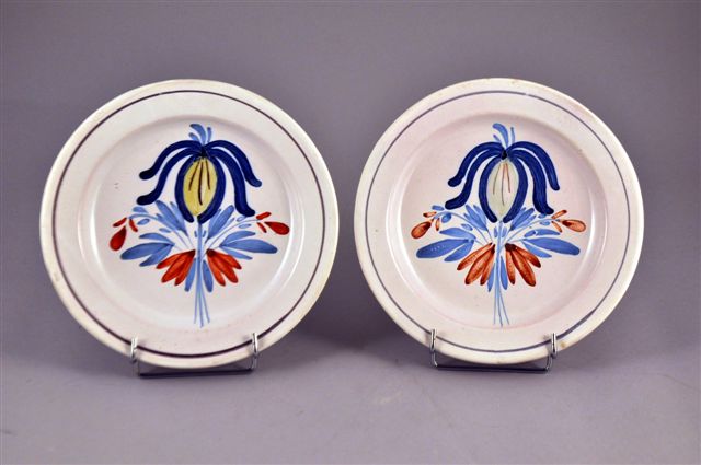 BOURGOGNE AUXERROISE. DEUX ASSIETTES en faïence à bord uni, à décor polychrome au centre d'un bouquet de fleurs stylisées, un liseré gris sur l'aile.