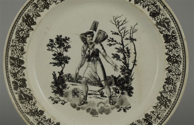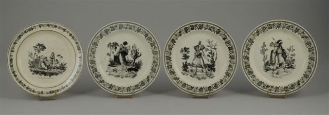 CREIL. SERIE de TROIS ASSIETTES en faïence fine à décor imprimé en noir de personnages allégoriques en pied pour les mois de Mars, Avril et juillet. Aile à frise de raie de coeur et pampres de vigne en frise. Marques en creux.