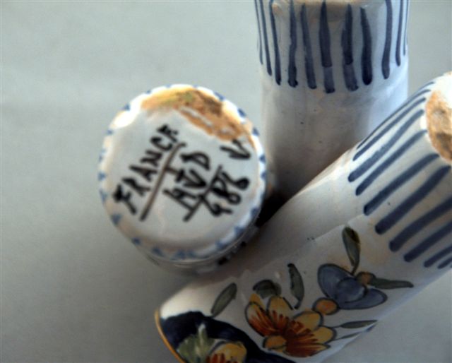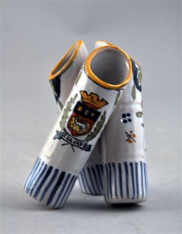 DÈSVRES. PORTE-FLEURS TRIPODE en faïence composé de trois tubes entrecroisés, à décor polychrome de l'écusson de la ville du Havre et de fleurs.