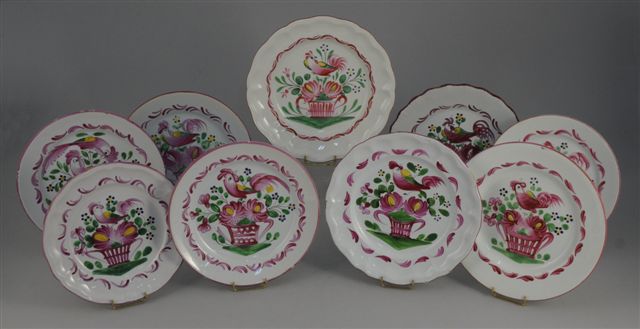 EST de la FRANCE. LOT de neuf ASSIETTES en faïence, décor au coq sur un panier. Ailes mouvementées pour certaines. Marque "Ket G Lunéville" en bleu pour deux (accidents)