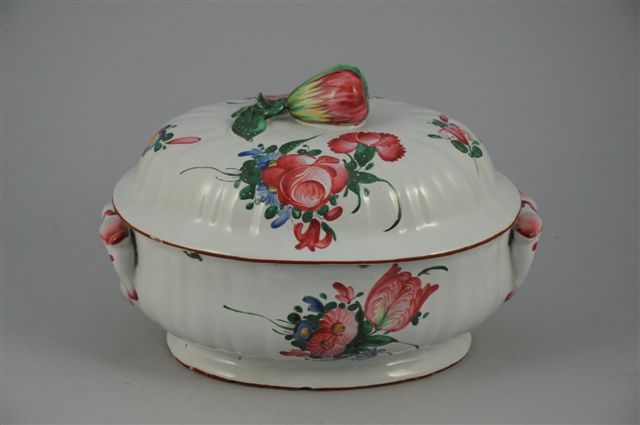 EST de la FRANCE. SOUPIERE ovale sur léger piédouche en faience à décor polychrome floral: roses, oeillets et tulipes. Le corps et le couvercle côtelées, la prise formée d'une poire.