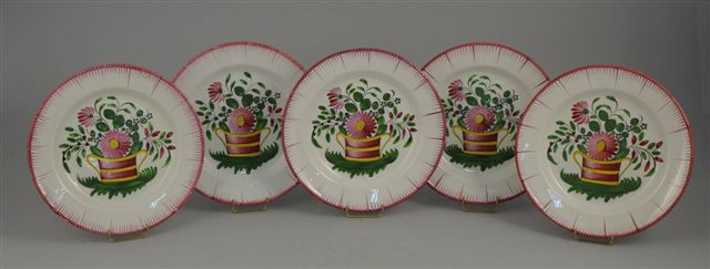 EST de la FRANCE. Suite de cinq ASSIETTES en faïence à aile au peigne, à décor dans le bassin de paniers fleuris. Diam. 23 cm (fêle à l'une)