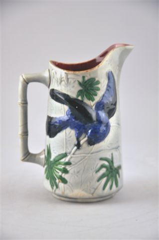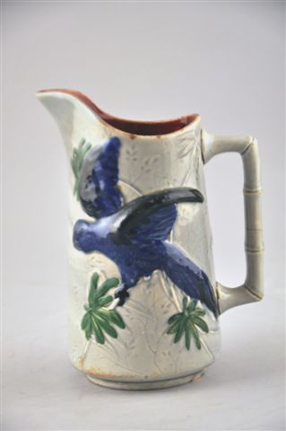 GIEN. BROC "AUX PERROQUETS" en barbotine, anse au bambou, à décor d'un perroquet en relief bleu et noir sur fond gris. Des branches et feuilles stylisées vertes complètent le décor. L'intérieur de couleur rouge foncé.