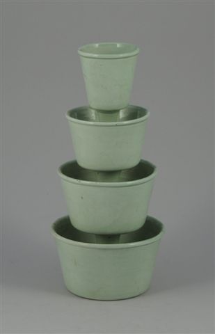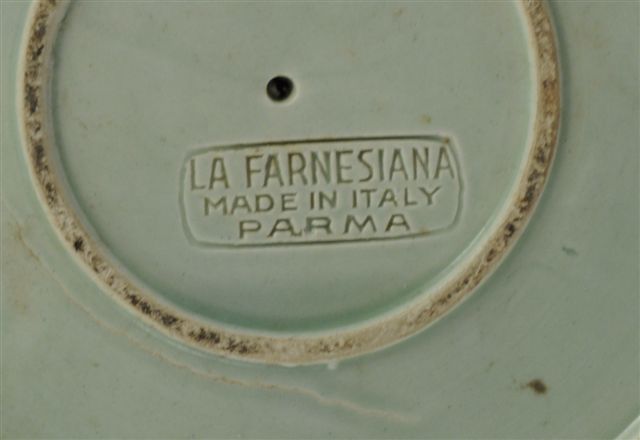 ITALIE. COUPE montée en céramique à glaçure vert, à quatre réceptacles creux, marquée en creux "La Farnesia, Italy, Parma". Haut. 36, Diam à la base: 17 cm (sautes d'émail)