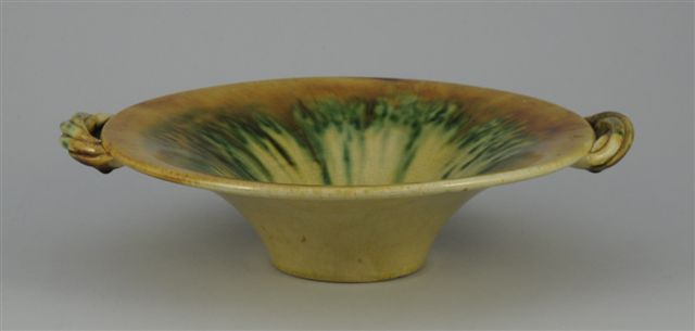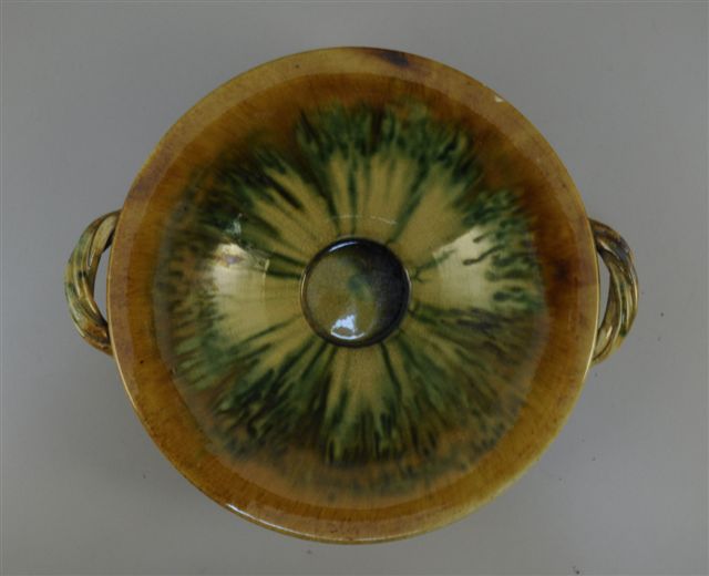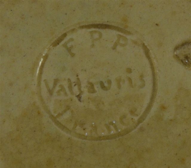 VALLAURIS. COUPE circulaire évasée en faïence à glaçure fauve, beige et verte. Anses cordiformes appliquées. Cachet en creux "FPP Vallauris France".