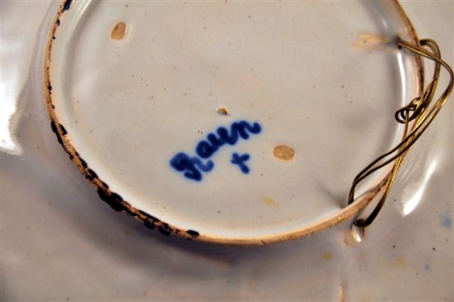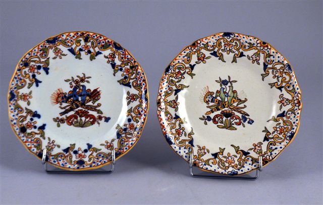 NEVERS (?). DEUX ASSIETTES en faïence à bord festonné, àd écor polychrome de deux colombes au carquois. Importante frise sur l'aile d'entrelacs et de fleurs.