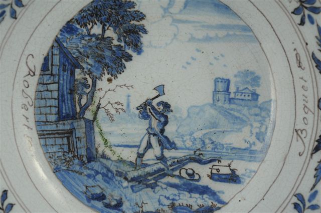 NEVERS?. JATTE en faïence de grand feu. Décor d'un bûcheron à sa tâche dans une perspective paysagée, patronyme en périphérie "Robert Boquet". Bordure à frise florale. Filets manganèse.