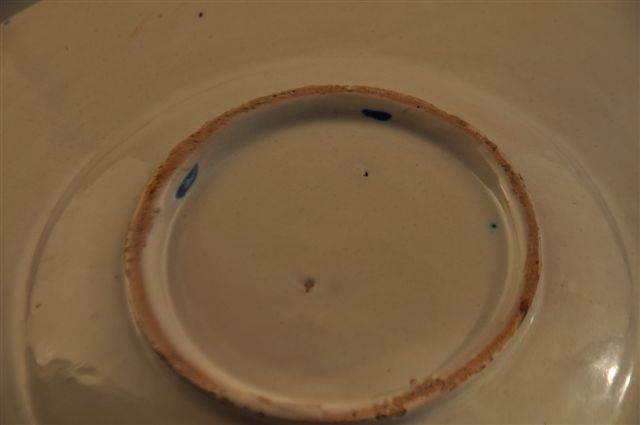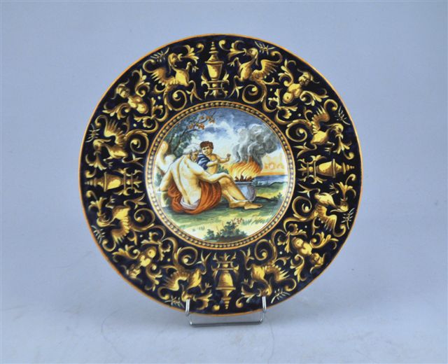 NEVERS. ASSIETTE À LARGE AILE en faïence, à décors "à quartiei" polychrome de la Renaissance Italienne représentant au centre une scène d'augure mythologique, l'aile décorée d'oiseaux fantastiques sur fond bleu.